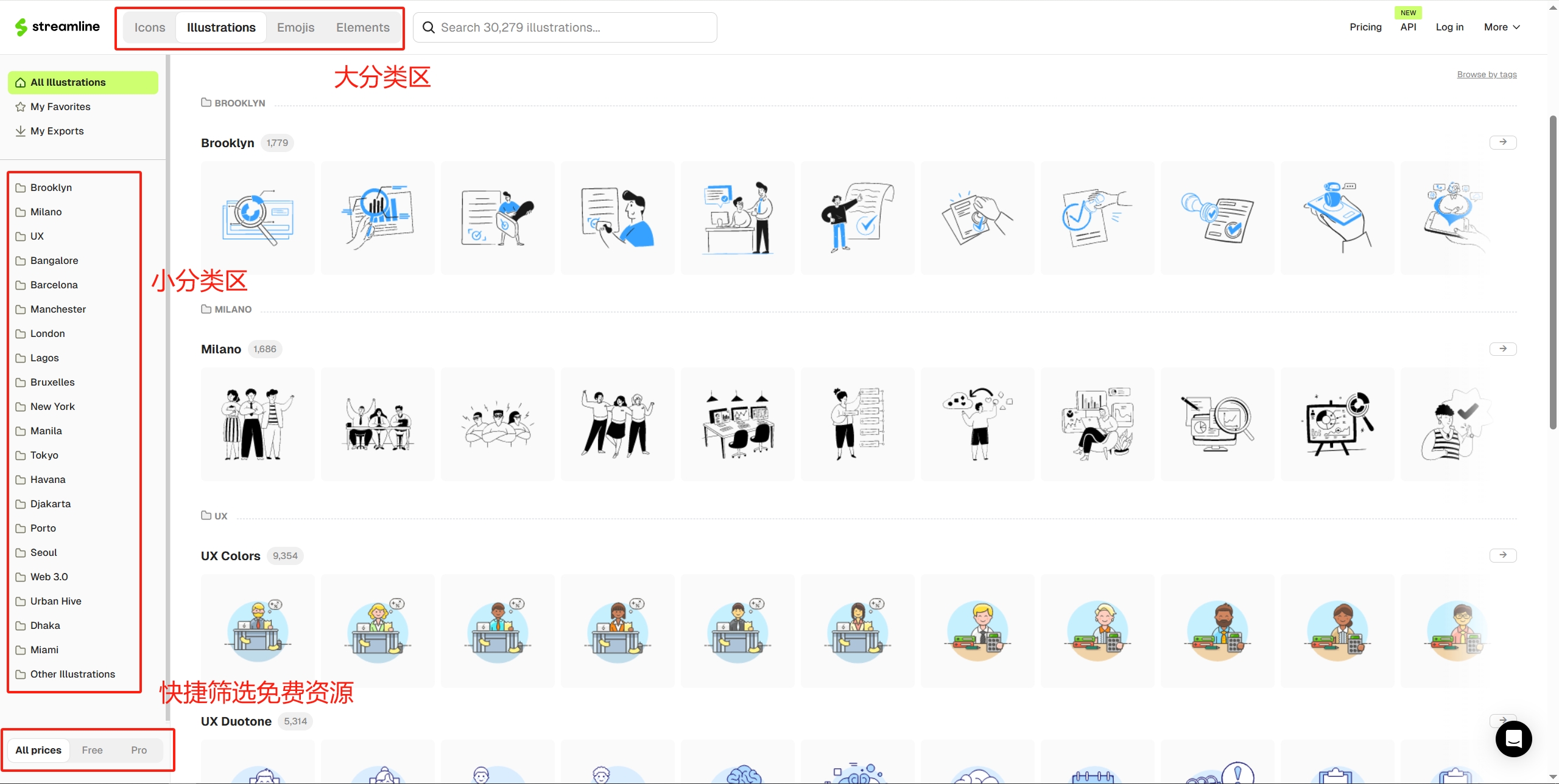 首页左上角可切换图标、插图、表情、元素大类,左侧可选择详细的分类,可以快速帮我们找到想要的素材!